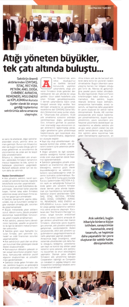 Recydia'nın Genel Müdürlüğüne Enrico FRIZ Atandı Basında Recydia 19.06.2017 Türkiye’nin Atık Yönetimindeki lider firmalarından Recydia A.Ş., Genel Müdürlük görevine... Süreko Çevre Haftası Kapsamında Manisa Kent Park Alanında Çocuklarla Buluştu Basında Recydia 12.06.2017 Atık Pil, Pet Şişe, Kağıt getirene ücretsiz eğlence Süreko Kula’daki Her Faaliyete Destek Olmaya Devam Ediyor Basında Recydia 30.01.2017 Kula’da inşaatı devam eden Şah Süleyman Camii için Süreko’dan anlamlı destek. Sanayici gözü ile Türkiye'de tehlikeli atın yönetimi Basında Recydia 10.09.2016 Atıkta değer aramamamız, atığa değer katmamız gerekiyor Basında Recydia 22.07.2016 Atığa Değer Katacak Basında Recydia 22.07.2016 Atığa Değer Katalım Basında Recydia 22.07.2016 Atıklarımızı ekonomiye kazandırarak güçlenebiliriz Basında Recydia 22.07.2016 Çevre Ödülü Recydia'nın Basında Recydia 8.06.2016 EED Yenilenebilir Enerjiyi Masaya Yatırdı Basında Recydia 25.05.2016 Türkiye’de atık yönetimi halen istenilen seviyeden uzak Basında Recydia 18.04.2016 Yeni Yıl Vesilesi ile Geçmişin Muhasebesi ve Sektörün Geleceği Basında Recydia 9.03.2016 Recydia A.Ş'den Ergün'e ziyaret Basında Recydia 11.02.2016 Manisa Büyükşehir Belediye Başkanı Cengiz Ergün, Recydia A.Ş. İş Geliştirme... Türkiye’nin İlk Gold Standard Onaylı Geri Kazanım Tesisi HEREKO Basında Recydia 29.12.2015 HEREKO’nun Türkiye’de ilklere İmza atan Mekanik Biyolojik Geri Kazanım Tesisi... Recydia Genel Müdürü Oğuz Can Paris’teki İklim Konferansındaydı Basında Recydia 23.12.2015 Recydia Genel Müdürü Oğuz Can, bu yıl 21.’si düzenlenen... Süreko LÖSEV’le Elele Basında Recydia 10.12.2015 2010 yılında kurulan LÖSEV Gıda Araştırma Laboratuvarı’ndan çıkan laboratuvar kimyasallarının... Atıkların Azaltılması Konuşuluyor Basında Recydia 1.11.2015 VI. Türk Alman Katı Atık Günleri - TAKAG 2015 Basında Recydia 2.06.2015 Recydia A.Ş., bünyesindeki Hereko A.Ş. ve Süreko A.Ş. ile beraber bu yıl altıncısı... 38. Uluslararası IAEE Konferansı Basında Recydia 25.05.2015 Recydia A.Ş.'nin de destekleyen kuruluşlar arasında yer aldığı 38. Uluslararası IAEE konferansı... 2. Akıllı Belediyecilik Zirvesi Bursa’daydı Basında Recydia 21.05.2015 Bu yıl, 14-15 Mayıs 2015 tarihlerinde Bursa Merinos Kongre Merkezi’nde gerçekleşen... ILO Yeşil Ekonomide İnsana Yakışır İşler Basında Recydia 15.05.2015 Recydia A.Ş. İstanbul Hereko Şubesi ‘’ILO Yeşil Ekonomide İnsana Yakışır İşler’’ raporunda yer aldı 2015’in Düşük Karbon Kahramanı Recydia Basında Recydia 3.04.2015 02.04.2015 Istanbul Carbon Zirvesinde, Recydia Hereko Kömürcü... İBB Genel Sekreteri Sn. Dr. Hayri Baraçlı Hereko Tesisindeydi Basında Recydia 2.03.2015 İBB Genel Sekreteri Dr. Hayri Baraçlı 24.01.2015 tarihinde Recydia... Kentsel Dönüşüm Zirvesi’nde Atık Yönetimi ve Geri Dönüşüm’ün Rolü Basında Recydia 30.01.2015 Recydia A.Ş. Kentsel Dönüşüm Zirvesi’ndeydi Enerji Ekonomisi, Mayıs’ta Antalya’da Konuşulacak Basında Recydia 7.11.2014 1979 yılından beri sektörde, dünyanın en köklü ve en önemli enerji kongresi olan... Ticaret Sicil Gazetesi Basında Recydia 6.11.2014 REW 2014 10. Yılında yoğun ilgiyle karşılandı Basında Recydia 19.06.2014 Bu yıl 10.’su düzenlenen REW 2014 Geri Dönüşüm, Çevre Teknolojileri ve Atık Yönetimi Uluslararası... Recydia A.Ş. Genel Müdürü Kentsel Atık Yönetimi Eğitimin sunumuyla katkıda bulundu Basında Recydia 27.03.2014 Avrupa Yatırım Bankası ve İller Bankası arasındaki Belediye Finansman Aracı Altında Teknik... HEREKO Sektöründe İlkelere İmza Atmaya Devam Ediyor Basında Recydia 31.01.2014 Çevre ve Atık Yönetimi ve geri kazanım faaliyetleriyle İstanbul Şile Kömürcüoda mevkiinde... Recydia A.Ş. Türkiye Inovasyon Haftası’ndaydı Basında Recydia 6.12.2013 Türkiye İhracatçılar Meclisi’nin (TİM) Ekonomi Bakanlığı’nın katkısıyla bu yıl ikincisini... Süreko LÖSEV’in Atıklarını Çevreye Geri Kazandırıyor Basında Recydia 16.09.2013 Recydia Yalın Altı Sigma Eğitim ve Projelerine başladı Basında Recydia 28.08.2013 Recydia, Yalın Altı Sigma'yı şirket kültürüne taşımak ve iş süreçlerine yansıtmak üzere... REW 2013 Fuarı , Tüyap-İstanbul Basında Recydia 10.07.2013 Atık ve Yenilenebilir Enerji Grubu Şirketleri, REW 2013 Fuarı’na damgasını vurdu! 2012'yi Geride Bırakırken Atık Yönetimi ve Geri Dönüşüm Sektörüne Bir Bakış Basında Recydia 1.01.2013 Günlük koşturmaca içerisinde yön duygusunu kaybetmemek için zaman zaman o toz... Yakma Tesisi Büyükşehirler için Uygun Model Basında Recydia 12.12.2012 Katı atık bertaraf tesisi özelliği de gösteren çimento sektörü, atık bertarafının arttırılmasında... Recydia: Geri Dönüştürerek, Süreko:Sürdürülebilir Ekoloji, Hereko:Her Daim Ekoloji Basında Recydia 18.10.2012 Türkiye'deki İlk Özel Entegre Geri Kazanım ve Bertaraf Firması... Atığı yöneten büyükler, tek çatı altında buluştu Basında Recydia 13.10.2012 Atık Yönetimi'nde adını sıkca duyduğumuz ve özellikle bertaraf konusunda yaptıkları çalışmalarla... Reydia A.Ş. İngiliz şirketini satın alarak dünyaya açıldı Basında Recydia 8.07.2012 İzmir Çimento Fabrikası Türk A.Ş.'nin (Çimentaş) bağlı ortaklığı olan ve atık ve yenilenebilir enerji... "Seragazı Salımlarımızın Yüzde 9'u Atık Kaynaklı" Basında Recydia 8.07.2012 Evsel ve endüstriyel atıklarımızın neden olduğu sorunlar, zannedildiğinin aksine, çevre kirliliği... Çimentaş geleceğe 'toz' kondurmuyor Basında Recydia 5.07.2012 Hürriyet Ege Enerji Oscarları 2012 Basında Recydia 8.06.2012 Enerji sektöründe faaliyet gösteren şirketler tarafından büyük ilgi gören Enerji Oscar'ları olarak bil